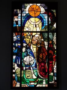 glas in loodraam dat ons geschonken is geplaatst in de pandgang van het klooster. Het is geplaatst op een frame met (zeer energiezuinige) LED-verlichting erachter.
