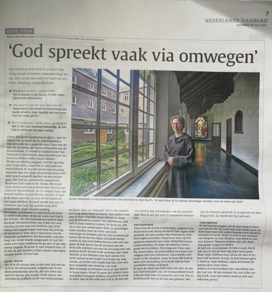 Op 18 juli jl. verscheen er een artikel in het Nederlands Dagblad waarin zuster Elisabeth aan het woord komt over hoe je de stem van God kunt herkennen. Het hele artikel kun je hieronder lezen.