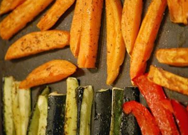 Verwarm de oven voor tot 180 C. Schil desgewenst en was alle groenten. Snijd ze in frietjes. Doe over in een ruime ovenschaal. Verwarm in een steelpannetje de ghee en voeg knoflook en kruiden toe. Haal van het vuur en giet dit over de groenten, schep goed om. Bestrooi met 1 el zout en bak goudbruin en knapperig in de voorverwarmde oven, ca 30 min. Schep halverwege een keer om. Bestrooi voor het serveren met de peterselie. Geef hier een tomatensaus met vega-gehakt bij.